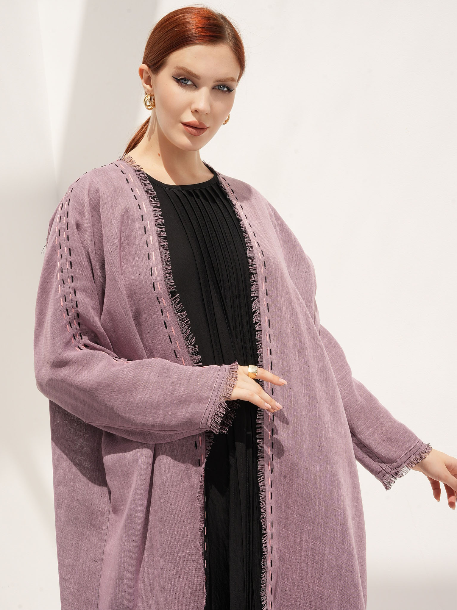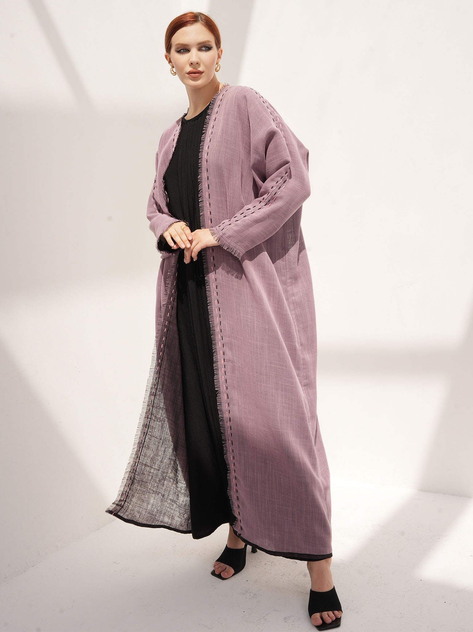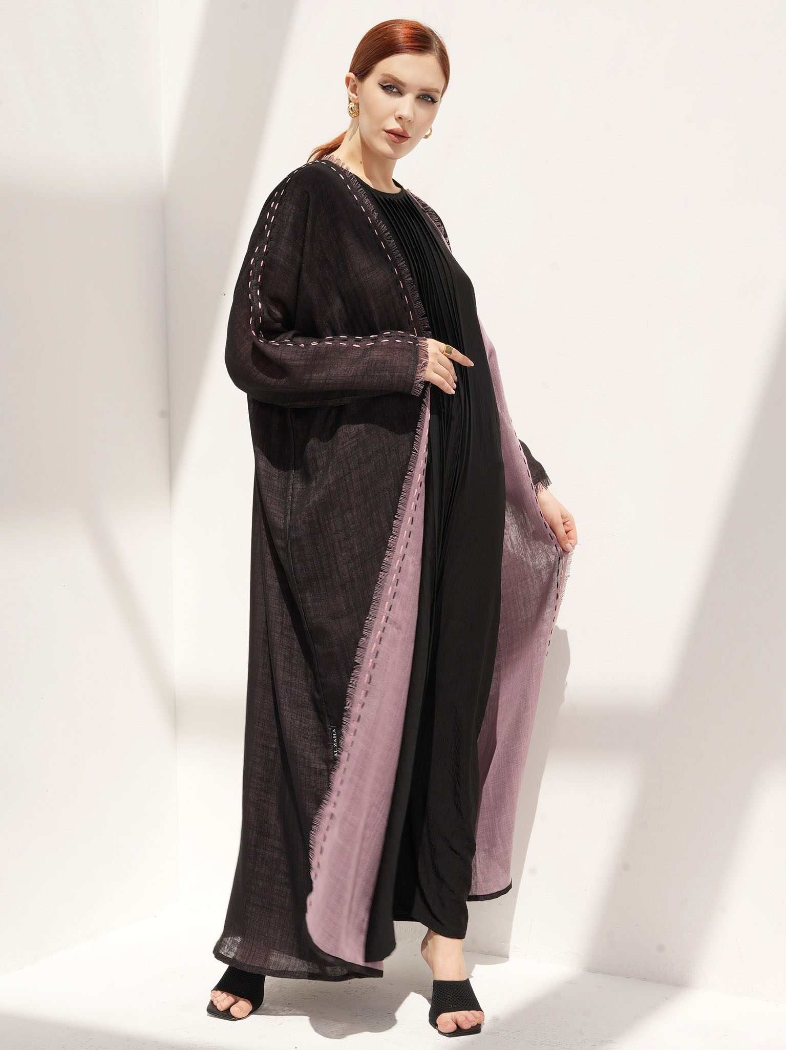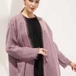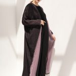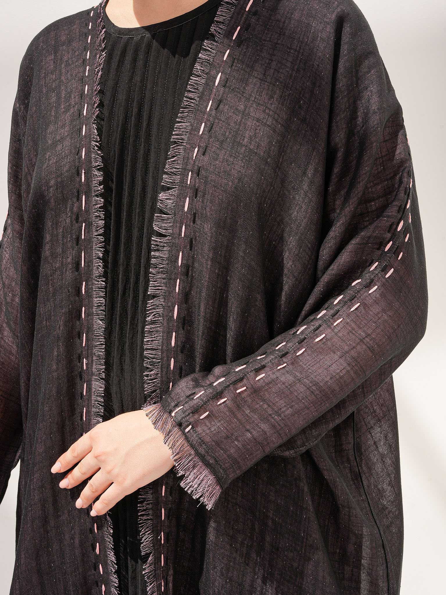 The Moire Abaya dual wear with exquisite handwork on the front and sleeves, extending up until the shoulders and comes in a saturated shade of pink and black, making it the ultimate choice for casual wear. This reversible abaya allows the handwork to be displayed from both sides. It is made from two-sides linen fabric, created when patterns overlap each other, making it perfect for reversible abayas.
