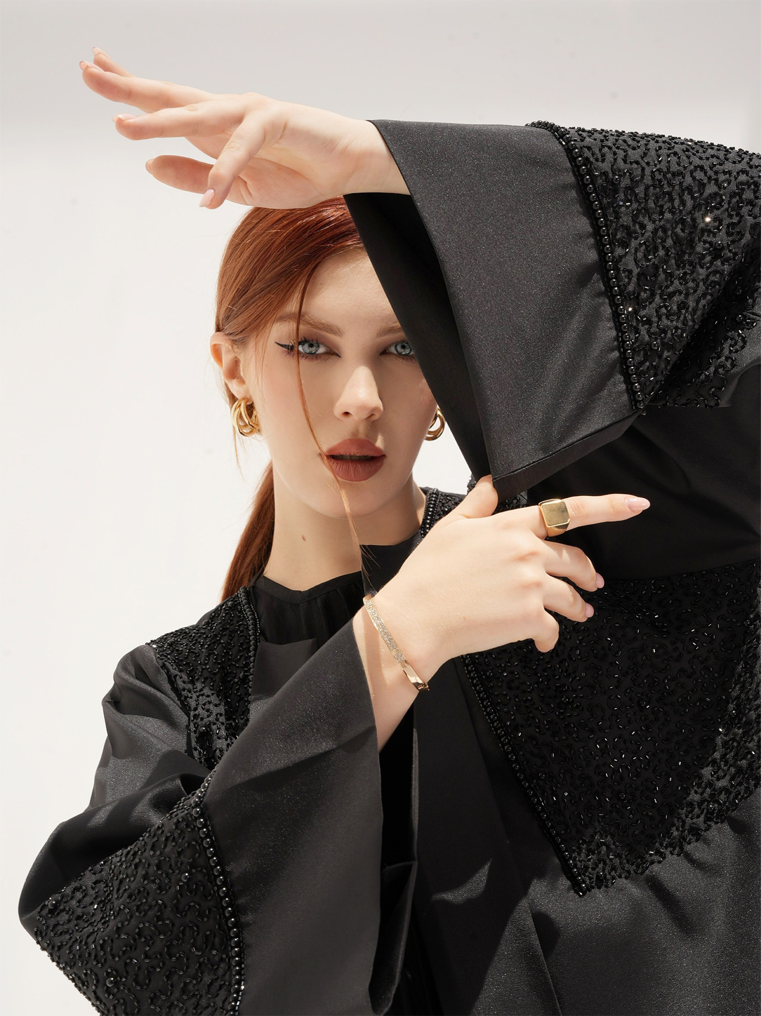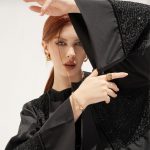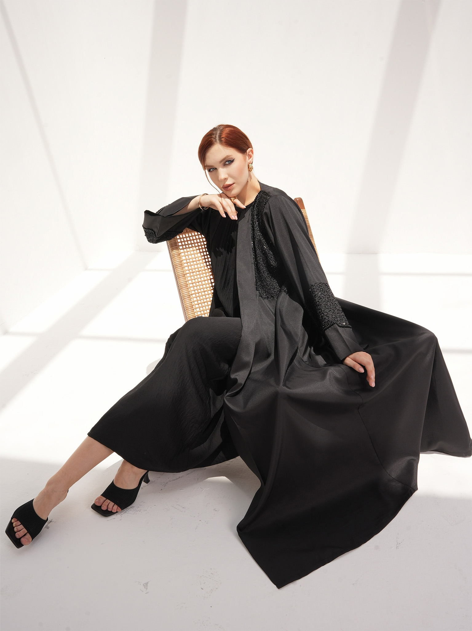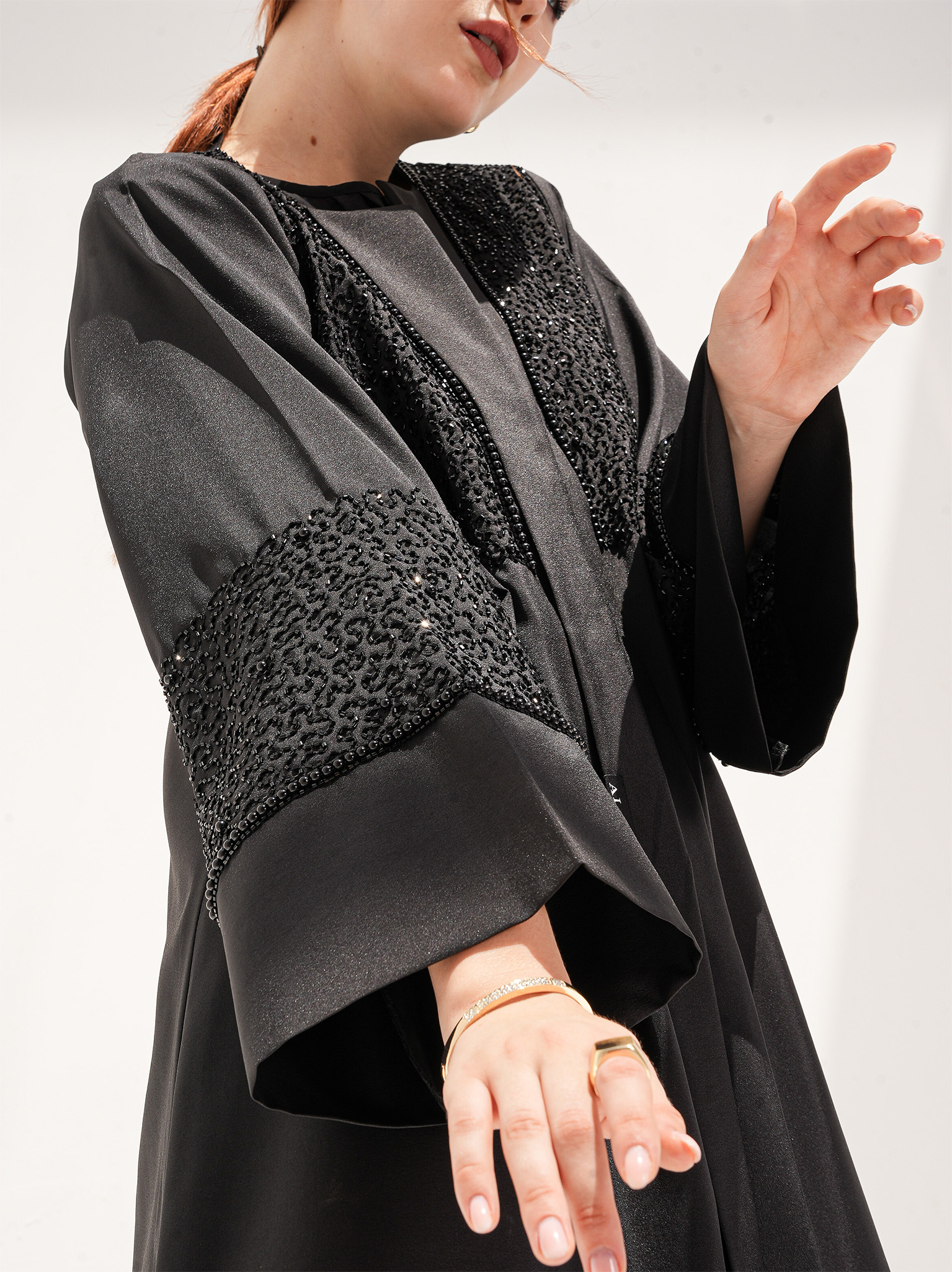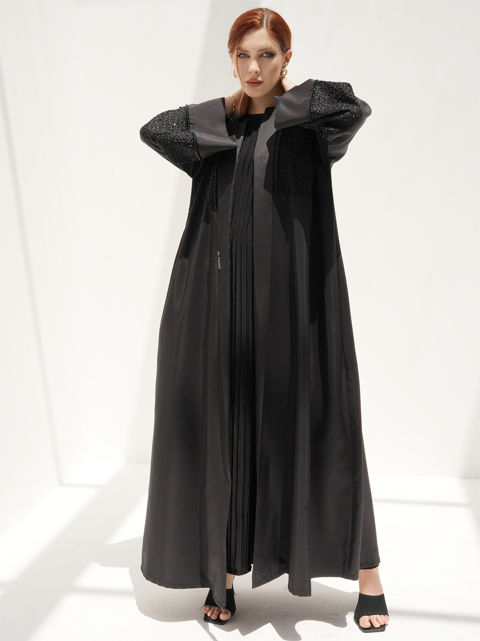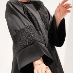 The Muse Abaya is a captivating evening wear with intricate thread and pearl work. This satin abaya showcases handcrafted detailing with pearls, while the sleeves feature a 7-inch work of art created with utmost dedication and effort. It comes with a matching Sheila to complete the ensemble.