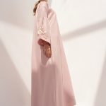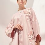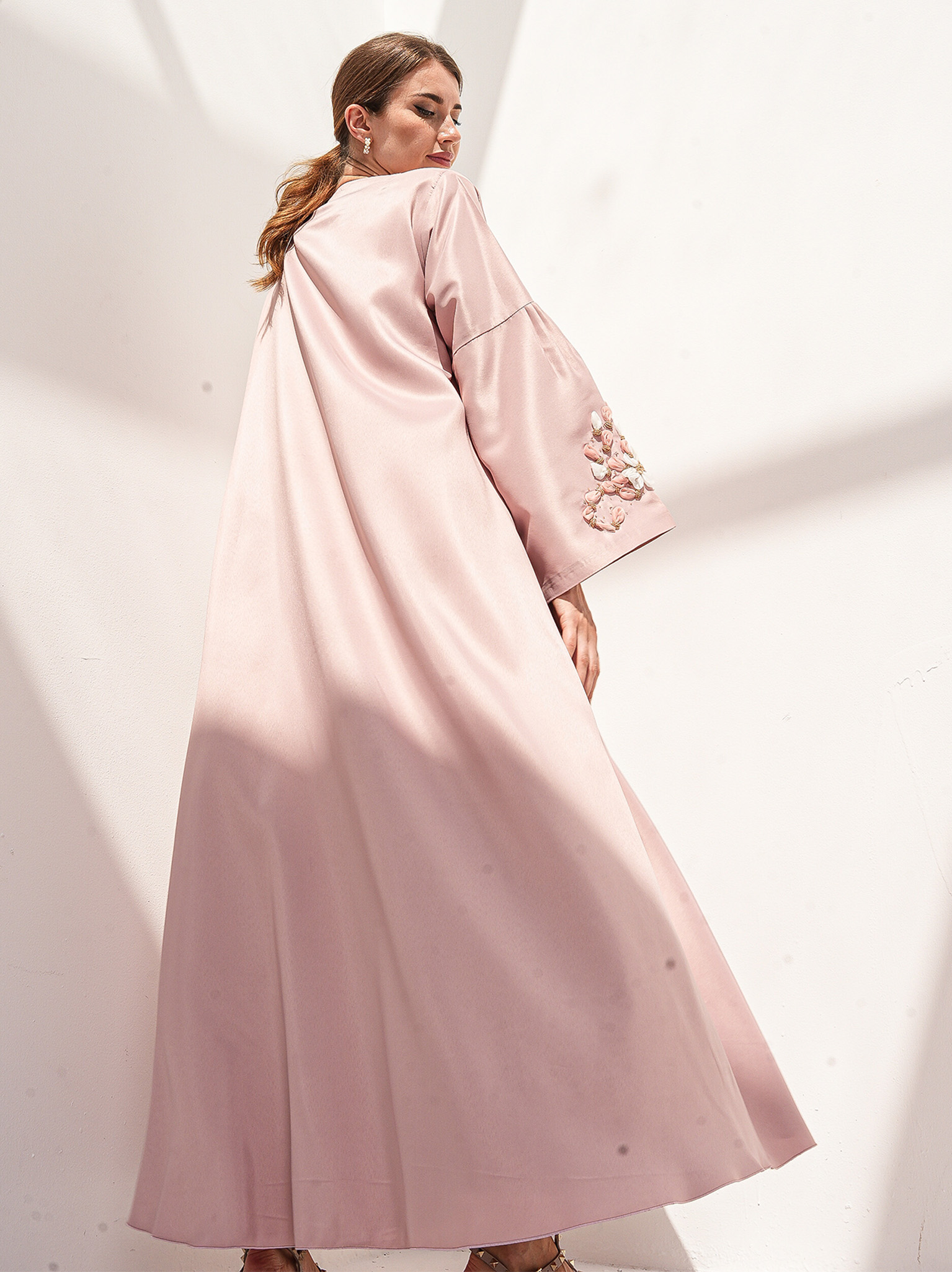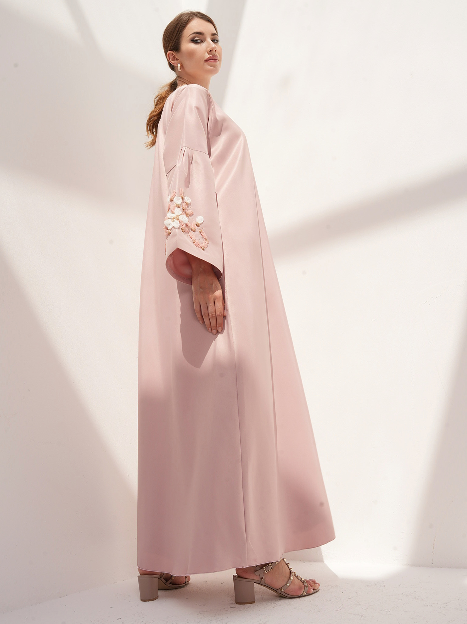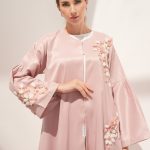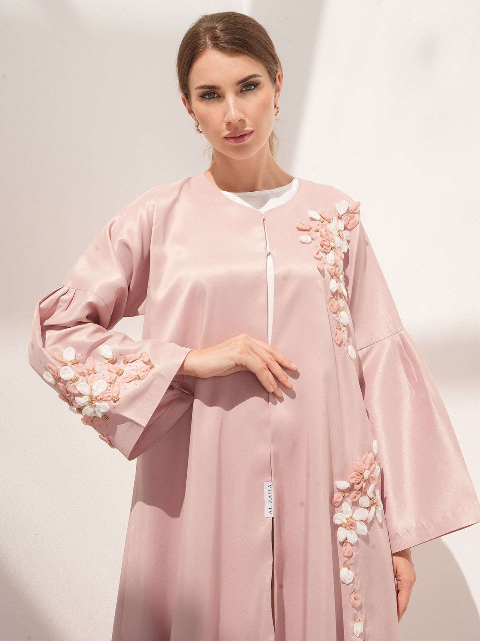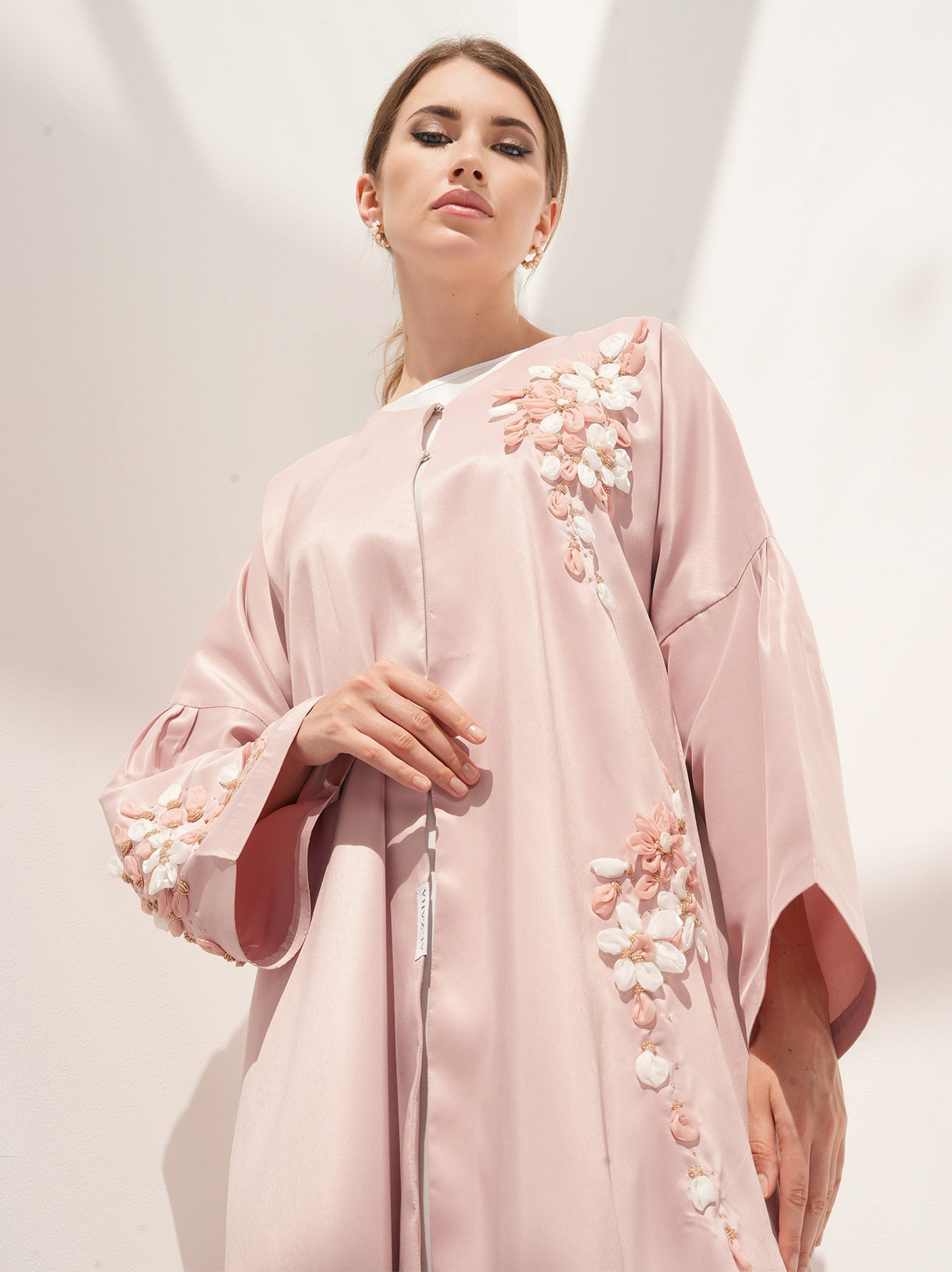 The Rosalee Abaya showcase stunning 3D floral embellishments, meticulously handcrafted to provide an immense sense of sophistication. The delicate tissue fabric is adorned with intricate pink and white flower work, complemented by small pearls. The floral design is featured on one sleeve and two on the front of the abaya. The inner slip is in white and the sheila will also be in white color to complete the ensemble.