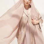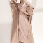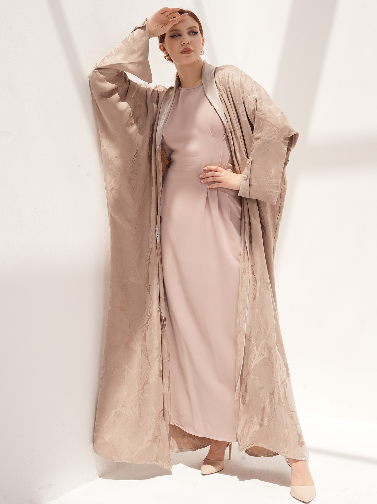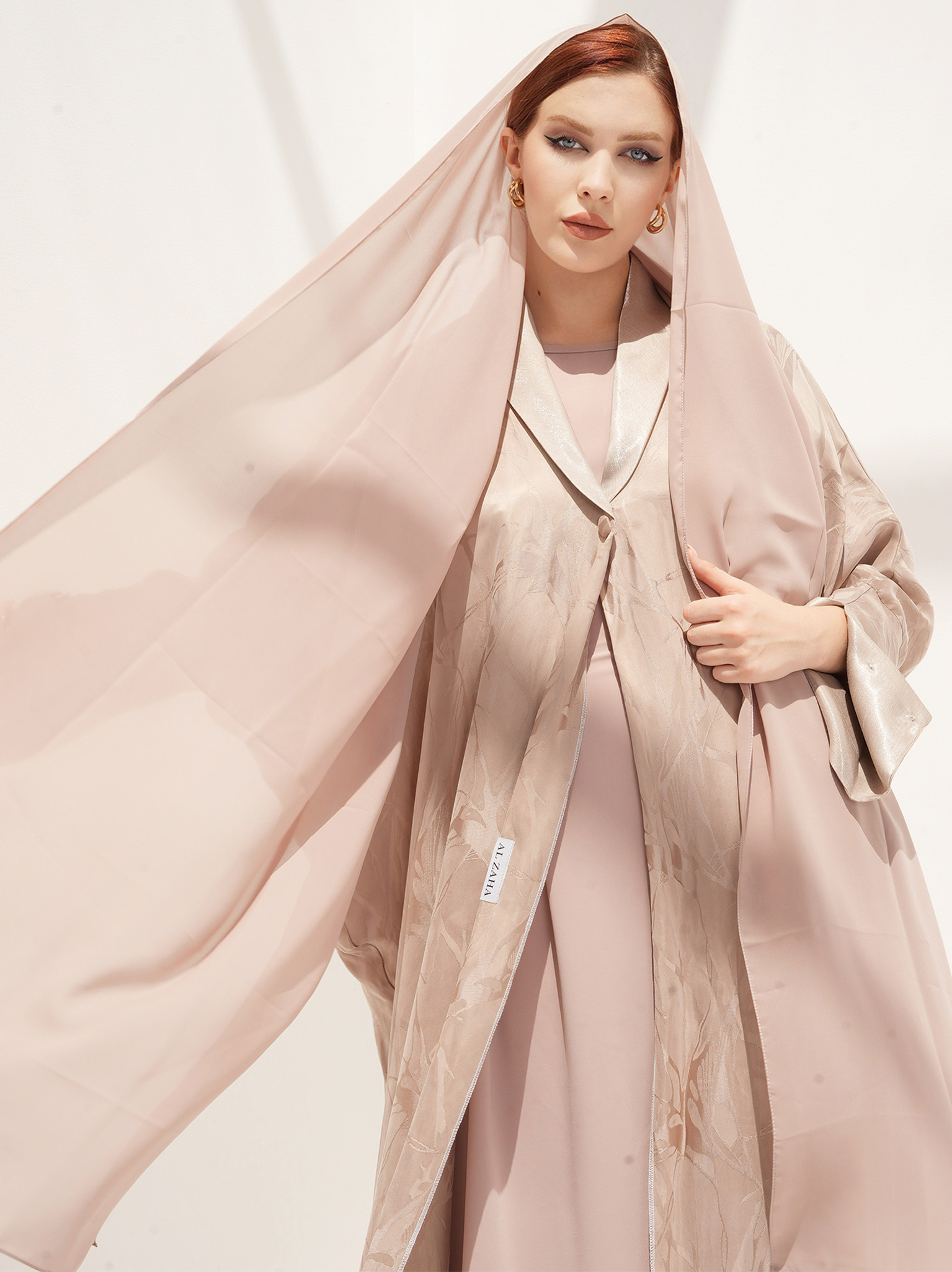 The Taupe Abaya is made of a lustrous fabric with a shining self-printing that gives it a lavish appearance. This abaya features a bisht-style cut, with a collar and sleeves made of a shimmering beige plain fabric. The sleeves’ cut is the highlight of this abaya, adding to its unique charm. the inner slip comes in a subtle ivory shade and inculdea a belt for personalized fitting. The design of the inner slip is bias-cut, enhancing the figure. it comes with matching beige sheila.