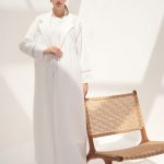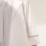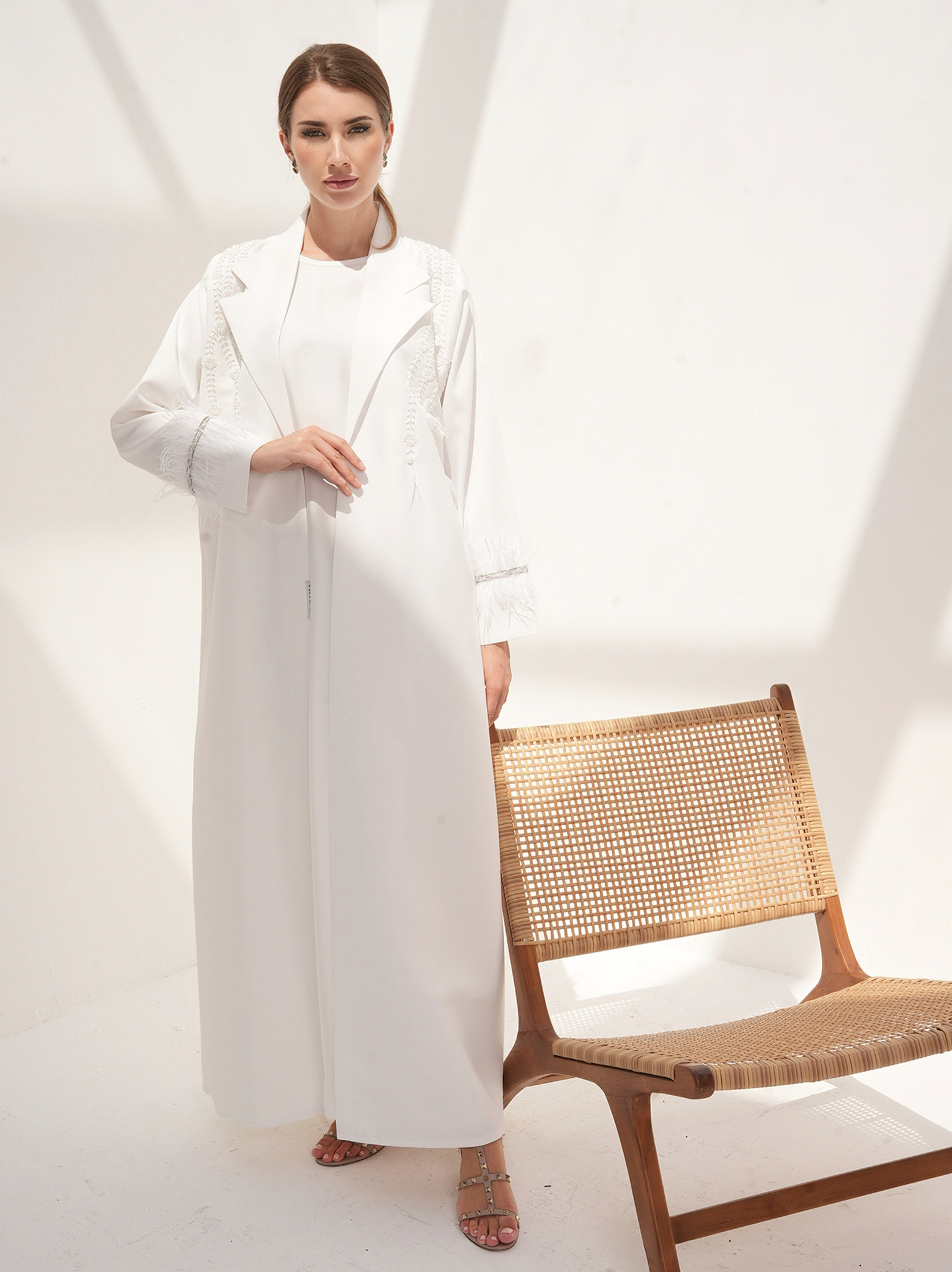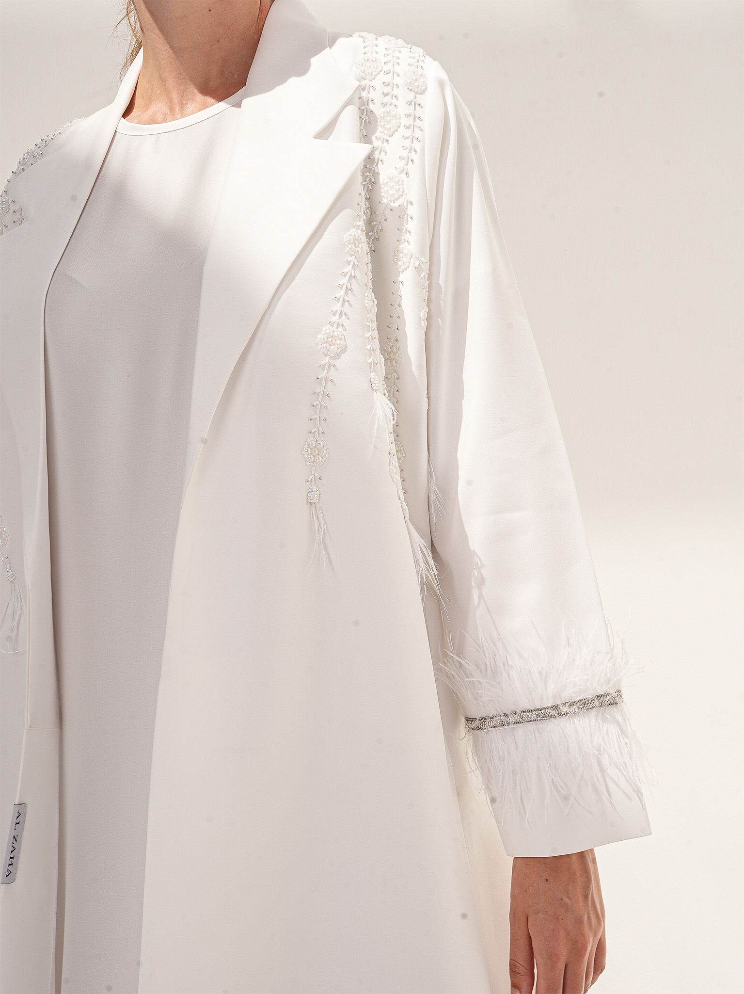 The white abaya is a pure white abaya adorned with exquisite pearl handwork on the upper body and soft feathers on the sleeves. The abaya is made from bridal satin fabric, adding to its luxurious feel. Completing the ensemble is a silk inner dress and a matching sheila.