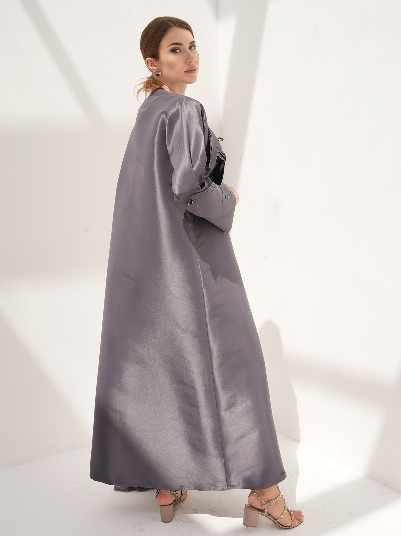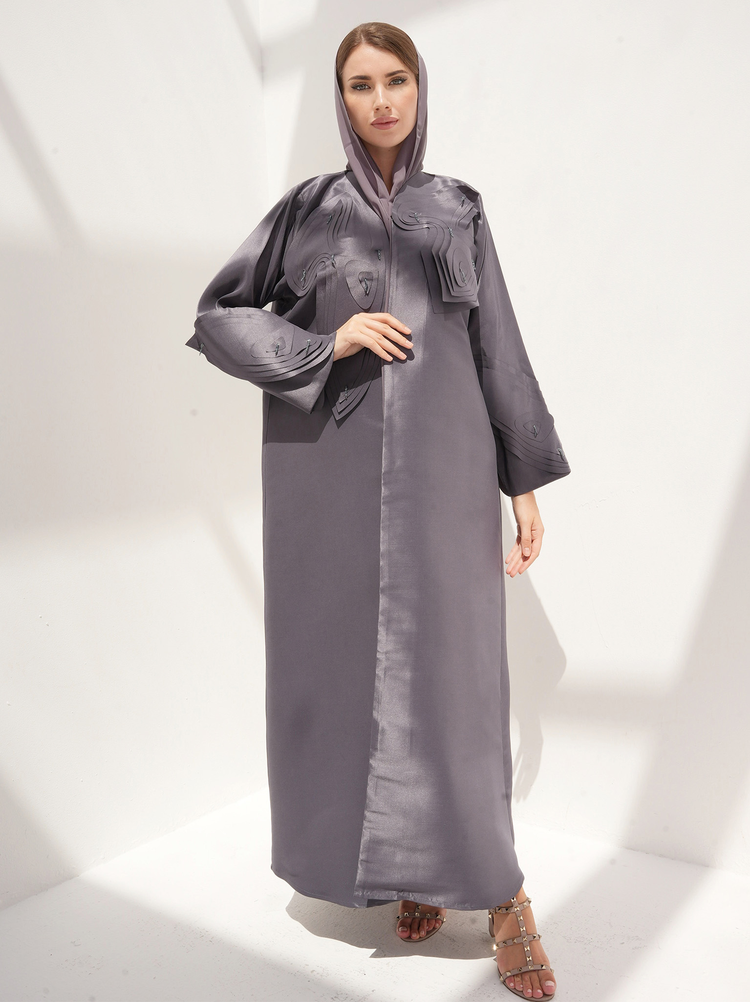 The abaya comes with greige sheila, and you can customize the inner slip according to your prefrence. color customization options are also available.
