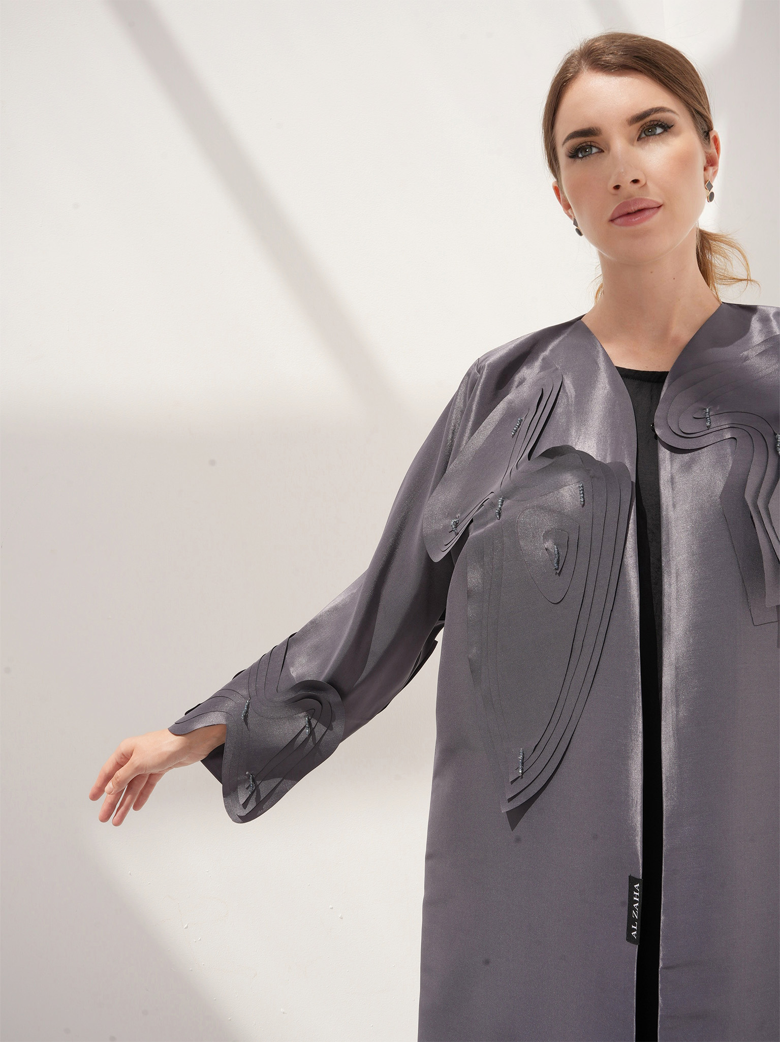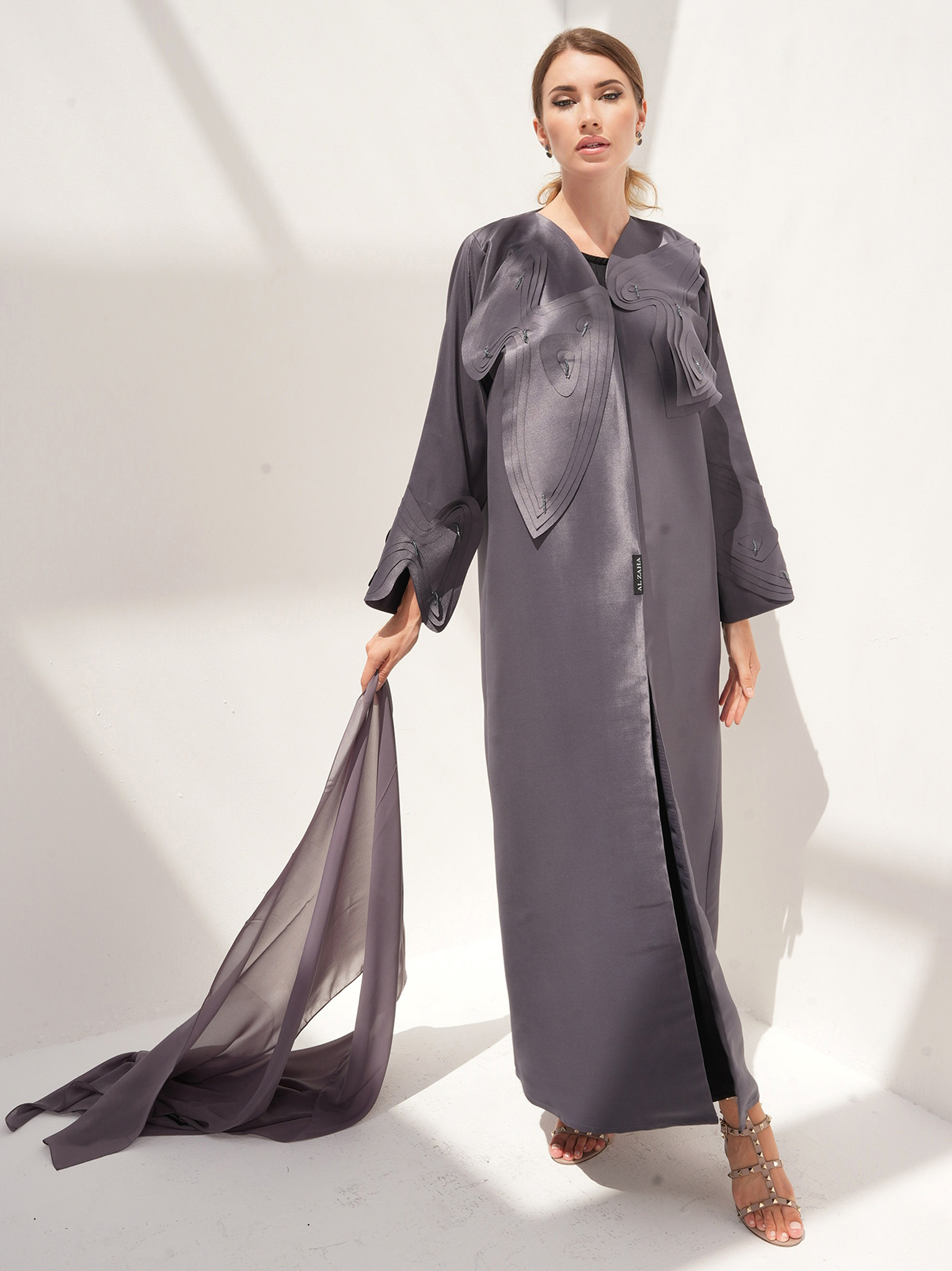 The twisted Abaya comes in a beautiful grey color, making it perfect for any season and occasion. The unique design of this abaya features cut flowers made from the same fabric, creating a layered pattern, and adorned with tassels. It offers a unique yet pleasing aesthetic.